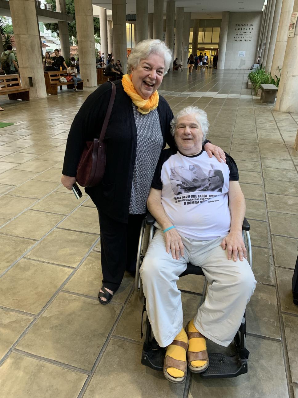 Encontro casual da profa. Margarida de Souza Neves (Núcleo) com o prof. Silvio Tendler (COM), no último dia de trabalho formal do prof. Tendler na Universidade.