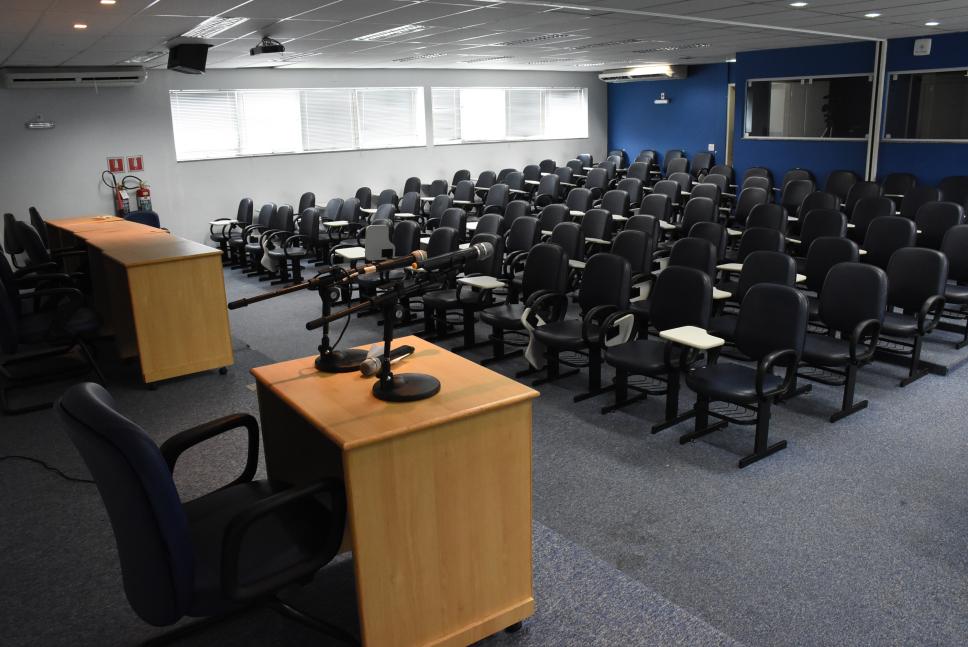 Vista do Auditório B8, na Ala Frings, vazio.