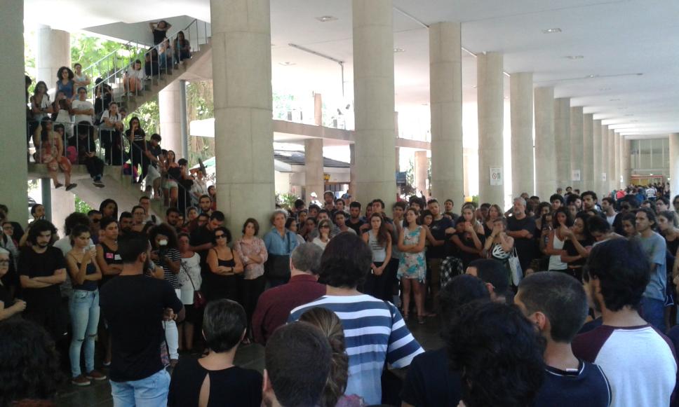 Manifestação nos pilotis com a participação de alunos, professores e funcionários.