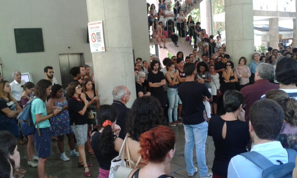 Manifestação nos pilotis com a participação de alunos, professores e funcionários.
