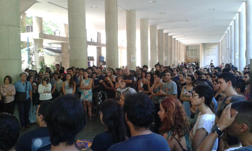 Manifestação nos pilotis com a participação de alunos, professores e funcionários.