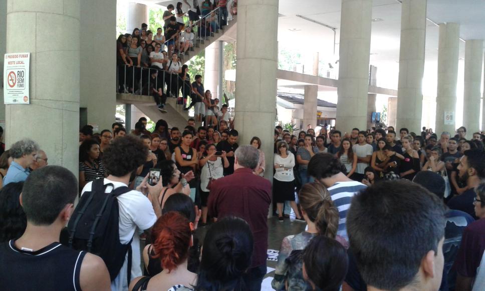 Manifestação nos pilotis com a participação de alunos, professores e funcionários.