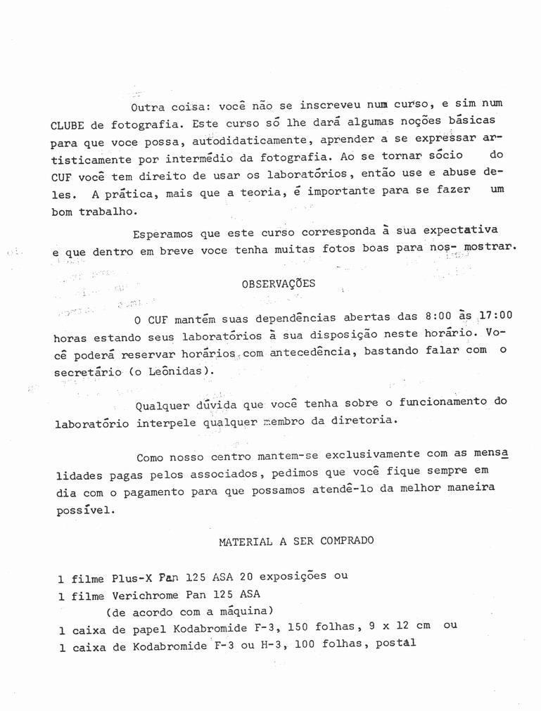 Folheto descritivo do curso básico de fotografia oferecido pelo CUF. Horário de funcionamento do CUF e lista do material a ser comprado para o curso.