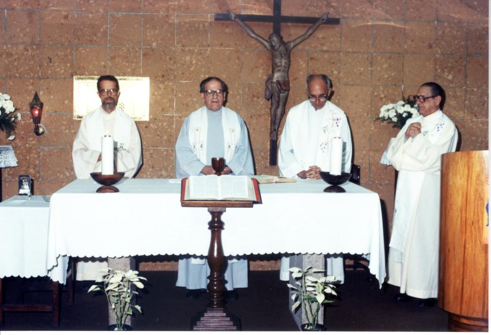 Missa comemorativa à inauguração da nova sede da Pastoral. Ao fundo, o crucifixo de madeira que posteriormente foi para a Igreja do Sagrado Coração de Jesus.