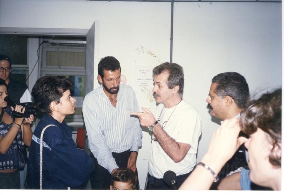 Presença dos líderes do MST (Movimento dos Sem Terra), José Rainha e Deolinda, para participação em debate sobre a reforma agrária realizado nos pilotis do Edifício da Amizade.