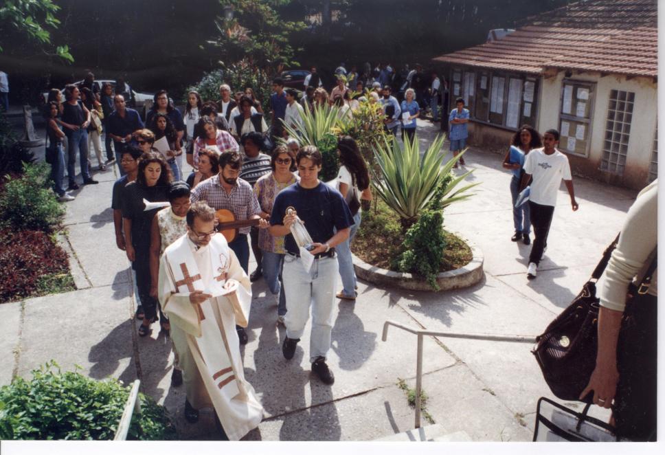 Procissão em homenagem à Nossa Senhora de Fátima. À direita, a sede da CCE.