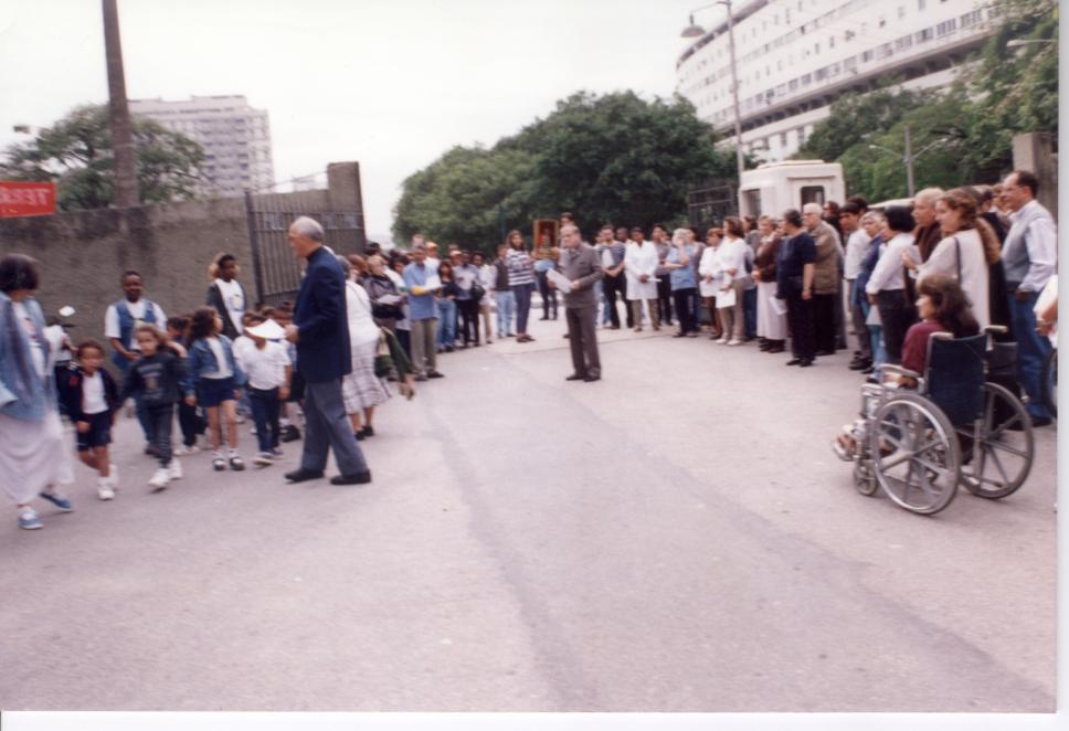 Visita da imagem de Nossa Senhora de Aparecida, que estava percorrendo as paróquias do Rio de Janeiro em preparação ao II Encontro Mundial do Papa com as Famílias. Ela ficaria aquele dia inteiro na capela da PUC-Rio. Pessoas aglomeradas na entrada da Universidade pela Av. Pe. Leonel Franca S.J..