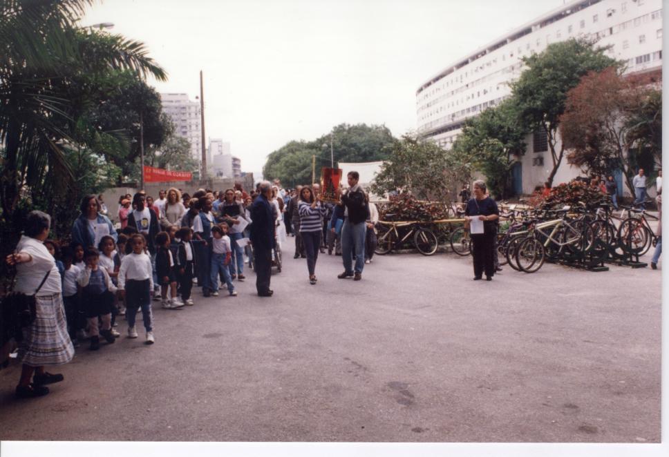 Visita da imagem de Nossa Senhora de Aparecida, que estava percorrendo as paróquias do Rio de Janeiro em preparação ao II Encontro Mundial do Papa com as Famílias. Ela ficaria aquele dia inteiro na capela da PUC-Rio. Pessoas acompanham a chegada da imagem.