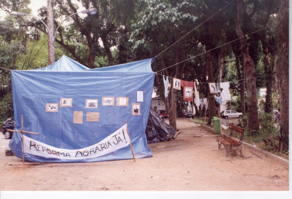II FEVUC - Feira de Valores da Universidade Católica. Tenda de lona e plásticos montada no estacionamento interno, com cartazes e faixa sobre reforma agrária.