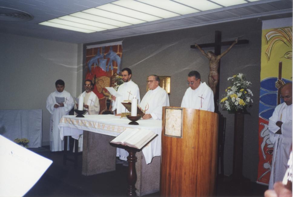Missa durante a Semana Inaciana (24 a 26/10/2000). Na parede atrás do altar, cristo crucificado em madeira que posteriormente foi colocado na parede lateral da Igreja do Sagrado Coração de Jesus.