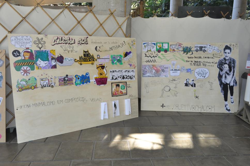 Decoração dos pilotis e estandes do evento NDesign. Painel do Coletivo Chá.