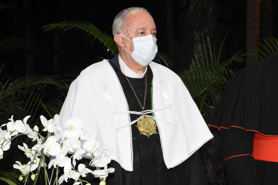 O pe. Josafá Carlos de Siqueira S.J., antes da transmissão do cargo, com as vestes e o medalhão que simbolizam o cargo de Reitor.