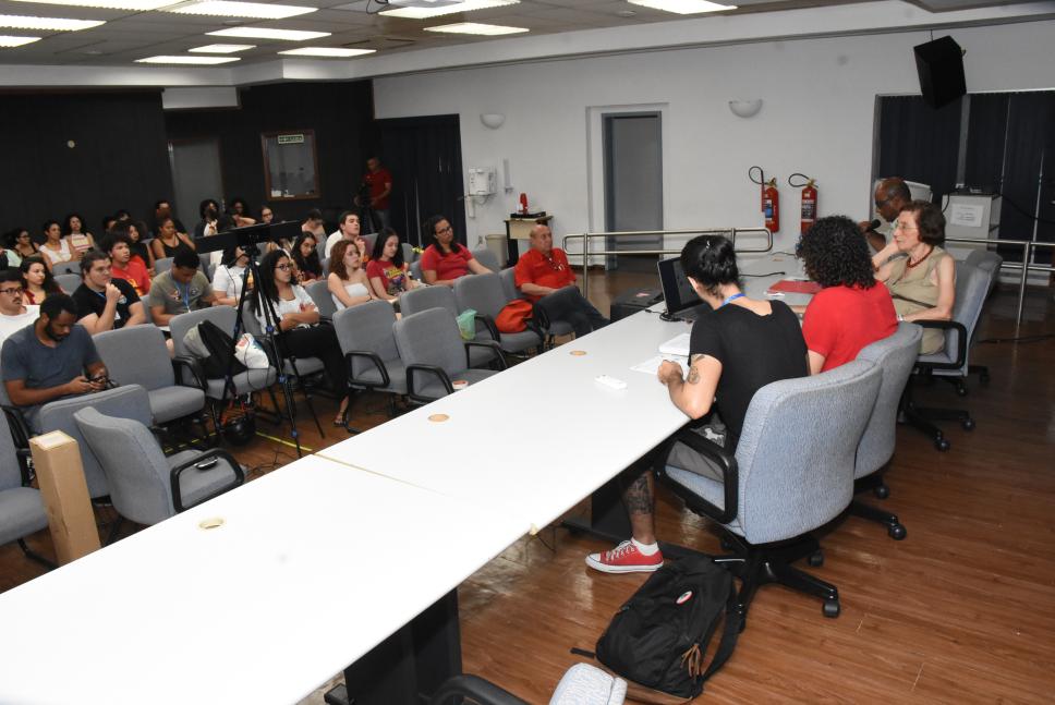 Mesa com palestrantes e plateia do evento.