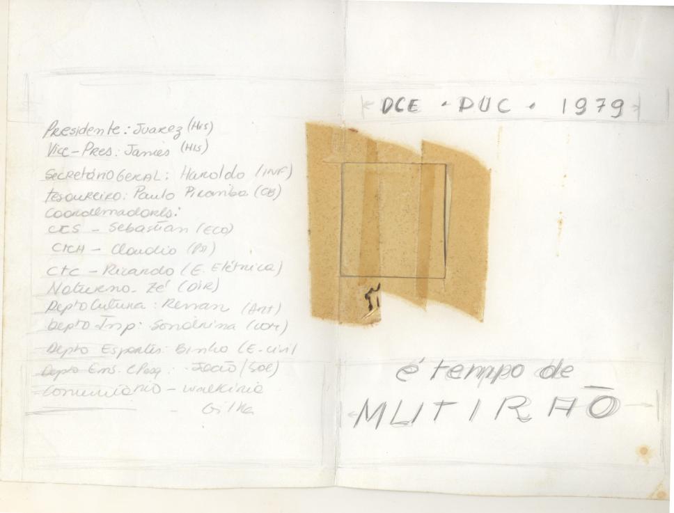 Verso da fotografia cg0185_050 com a lista manuscrita dos integrantes da chapa Mutirão que concorreu e venceu as eleições para o DCE em 1979.