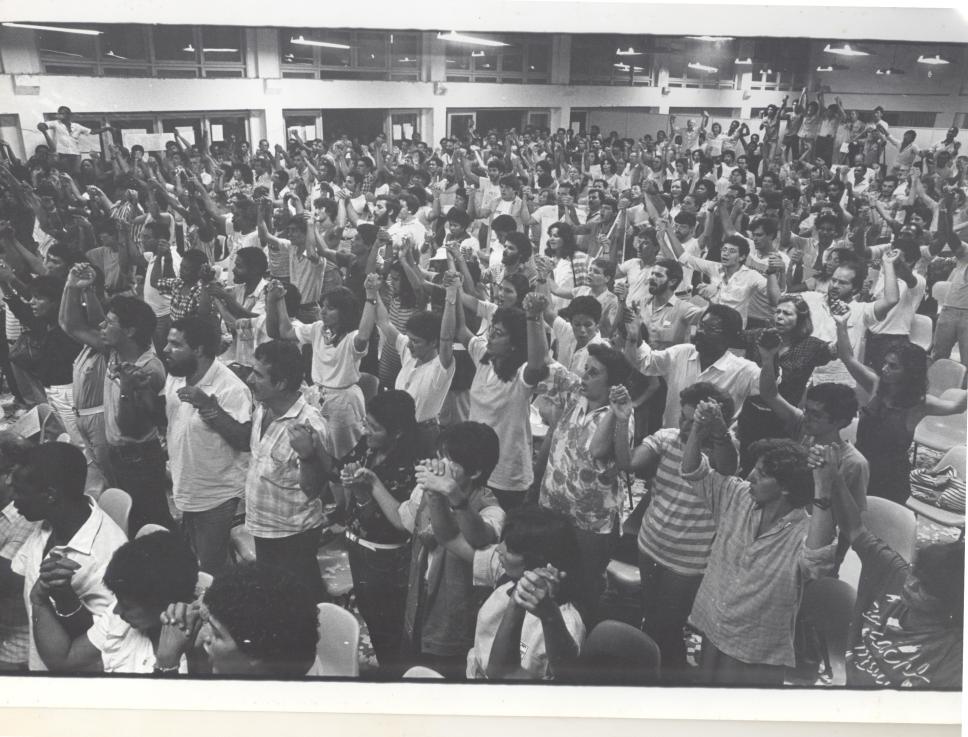 Assembleia de greve dos funcionários da PUC-Rio. Funcionários de mãos dadas e braços elevados. A greve chegou a ser decretada, mas negociações em dias posteriores levaram a um acordo e a greve foi cancelada.