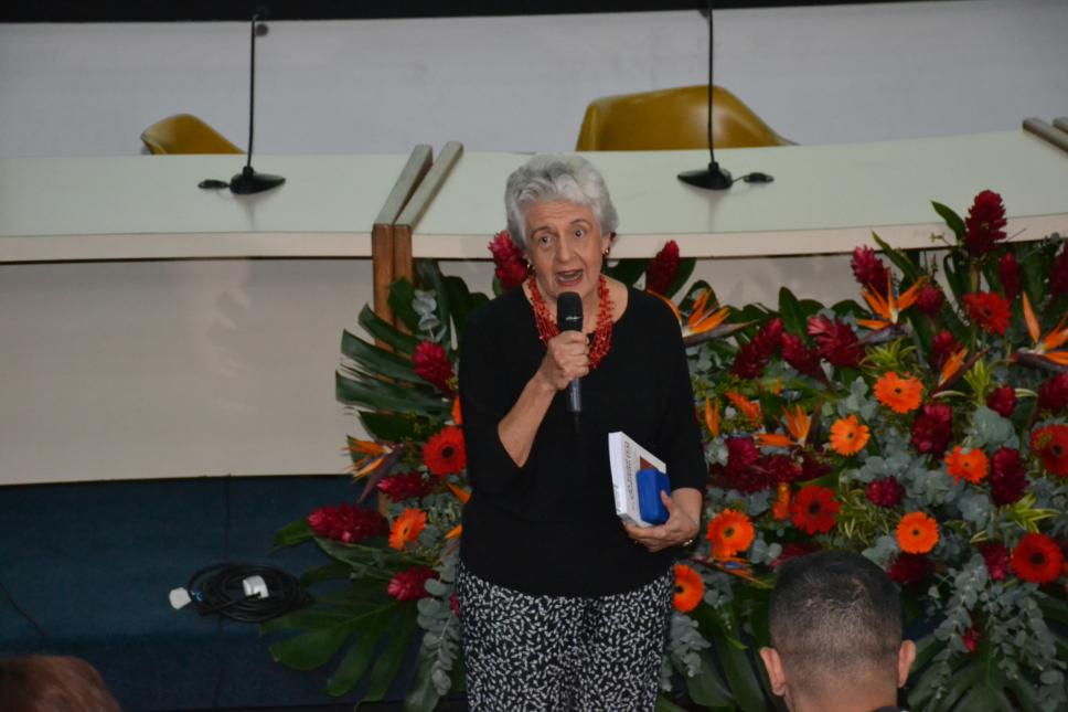 A profa. Luiza Ermel faz discurso após ser homenageada.