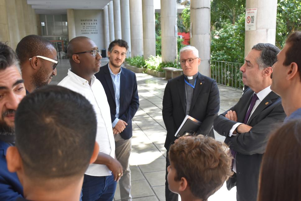 Recepção dos palestrantes e do Ministro e Presidente do STF Luís Roberto Barroso nos pilotis da Ala Kennedy.
