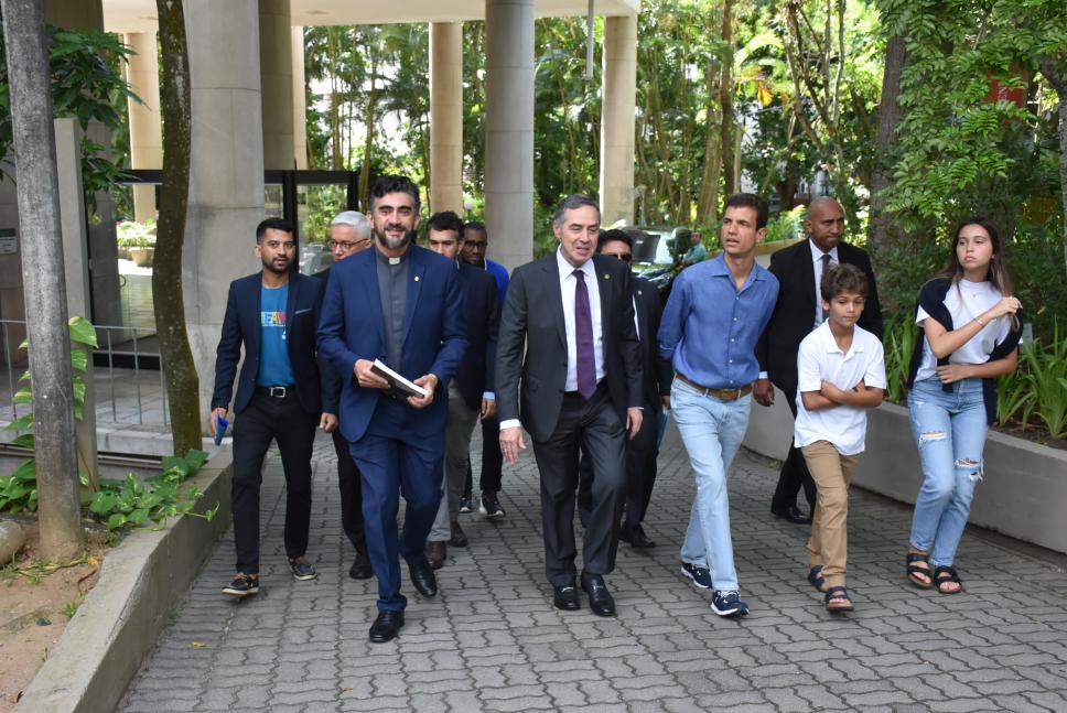 Da esq. para dir.: Davison da Silva Coutinho (NEAM), pe. Arnaldo Rodrigues (COM, Igreja do Sagrado Coração de Jesus), Prof. Pe. Anderson Antonio Pedroso S.J. (DAD, Reitor), Vinicius Kede (REI), Ministro e Presidente do STF Luís Roberto Barroso.
