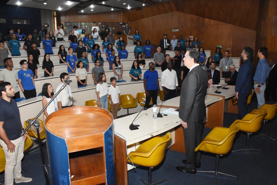 Na mesa da esq. para dir.: Ministro e Presidente do STF Luís Roberto Barroso, André Street e o Prof. Pe. Anderson Antonio Pedroso S.J. (DAD, Reitor).