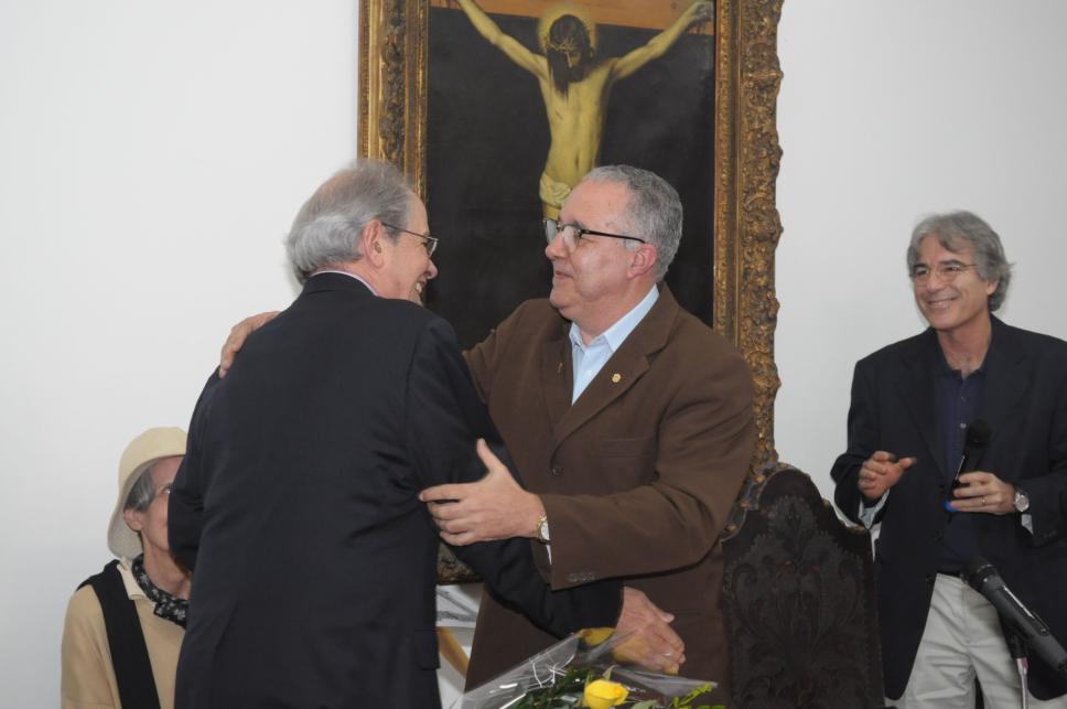 Pe. Josafá S.J. cumprimenta o professor emérito Oswaldo Chateaubriand Filho.