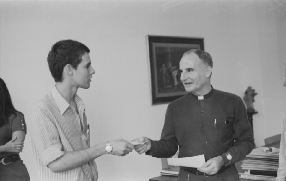 Reitor pe. Ormindo Sodré S.J. entrega um certificado ou um cheque a participante premiado na Semana da PUC de 1971.