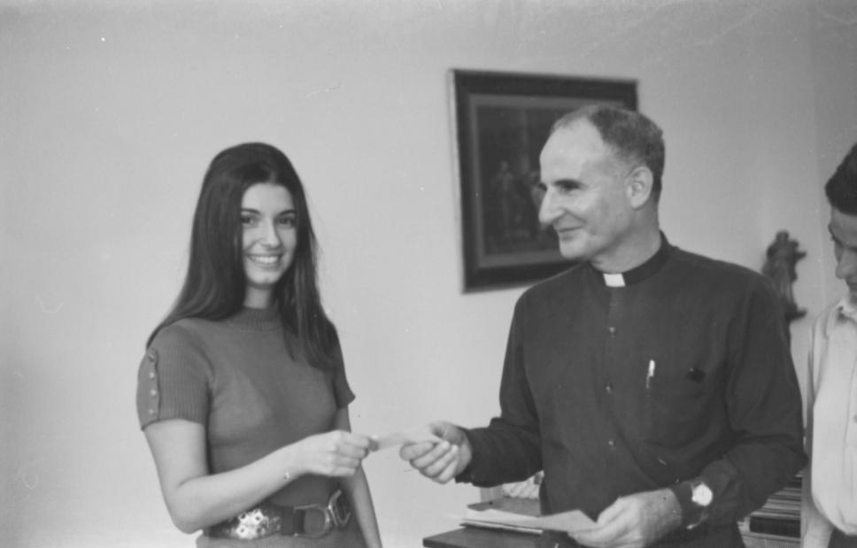 Reitor pe. Ormindo Sodré entrega prêmio à participante na Semana da PUC de 1971.