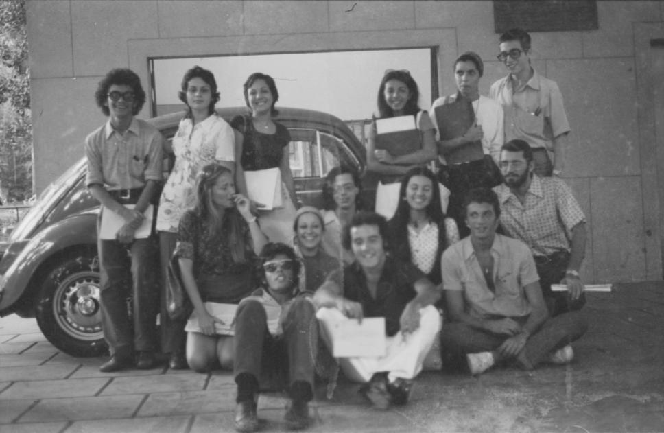 Participantes e premiados na Semana da PUC de 1971, em frente aos elevadores da Ala Kennedy, encostados em um Fusca, entregue como prêmio provavelmente da gincana.