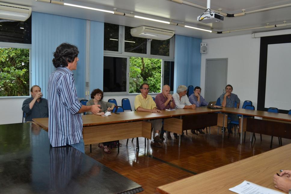 Lado esquerdo da mesa - da esq. para dir.: n.i., n.i., n.i., n.i., prof. Alfredo Jefferson de Oliveira (DAD), prof. Luiz Alencar Reis da Silva Mello (CETUC), n.i.