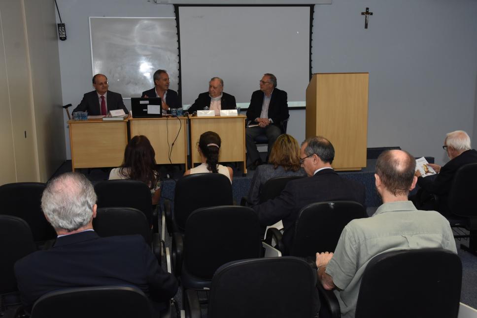 Da esq. para dir.: na mesa - prof. Danilo Marcondes (FIL), prof. pe. Francisco Ivern (REI), prof. Pedro José Calafate (Universidade de Lisboa) e prof. Juan Enrique Varona (Vice-Reitor da Universidade da Cantabria)