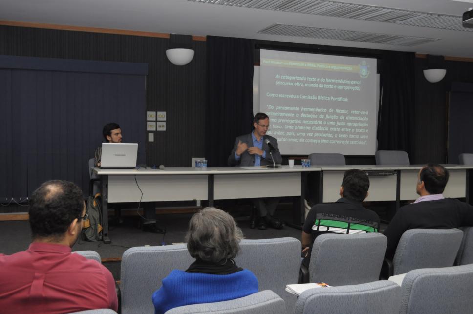 Palestrante na mesa de apresentação e plateia da conferência.