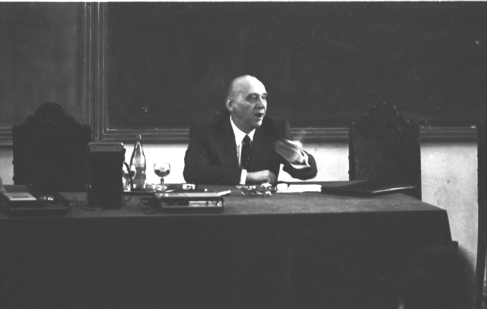Palestrante na mesa de conferência sobre semiótica linguística.