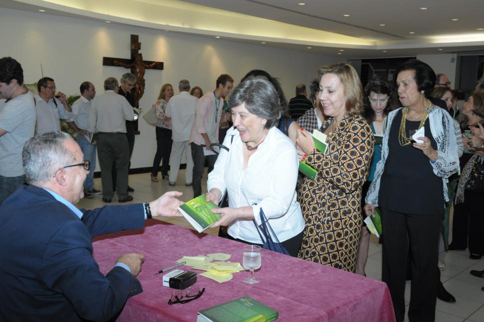 Reitor Pe. Josafá S.J. entrega livro autografado para convidada.