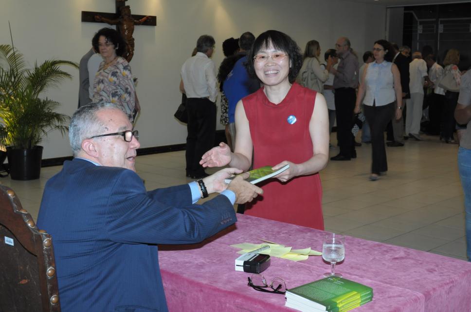 Convidado cumprimenta o Reitor Pe. Josafá S.J. na mesa de autógrafos.