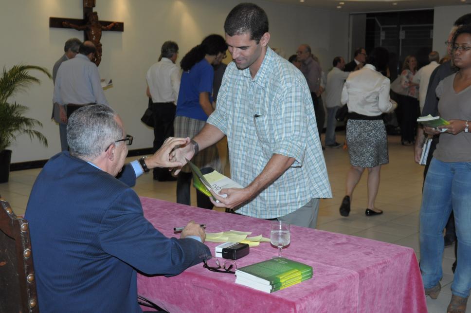 Convidado cumprimenta o Reitor Pe. Josafá S.J. na mesa de autógrafos.