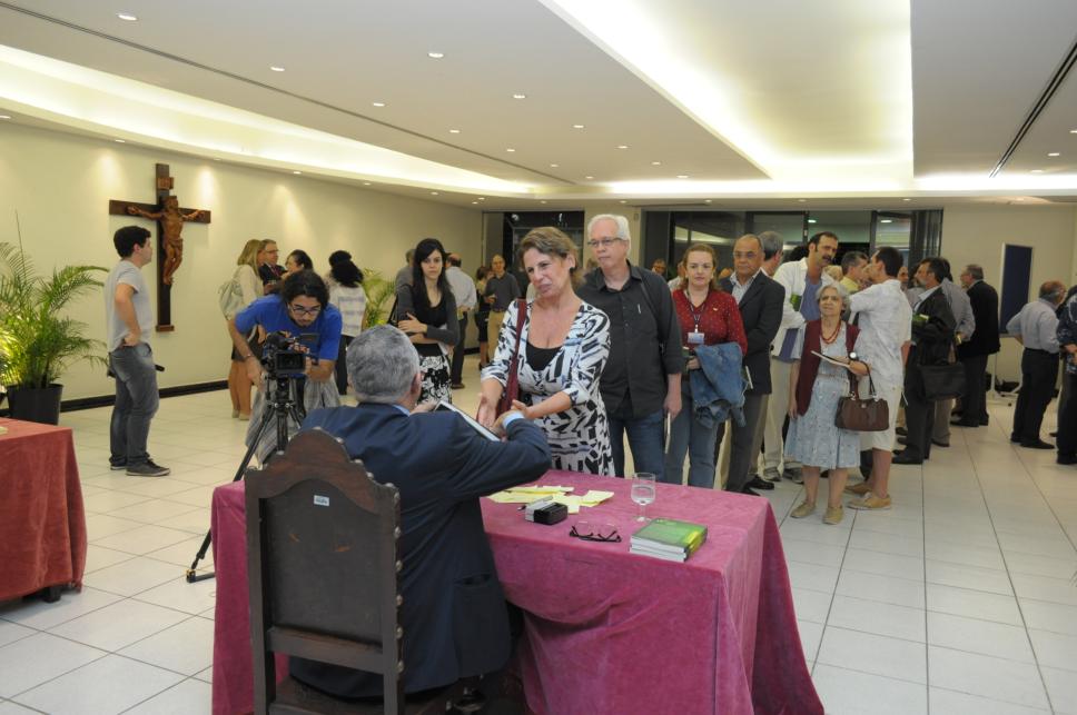 Convidado cumprimenta o Reitor Pe. Josafá S.J. na mesa de autógrafos.