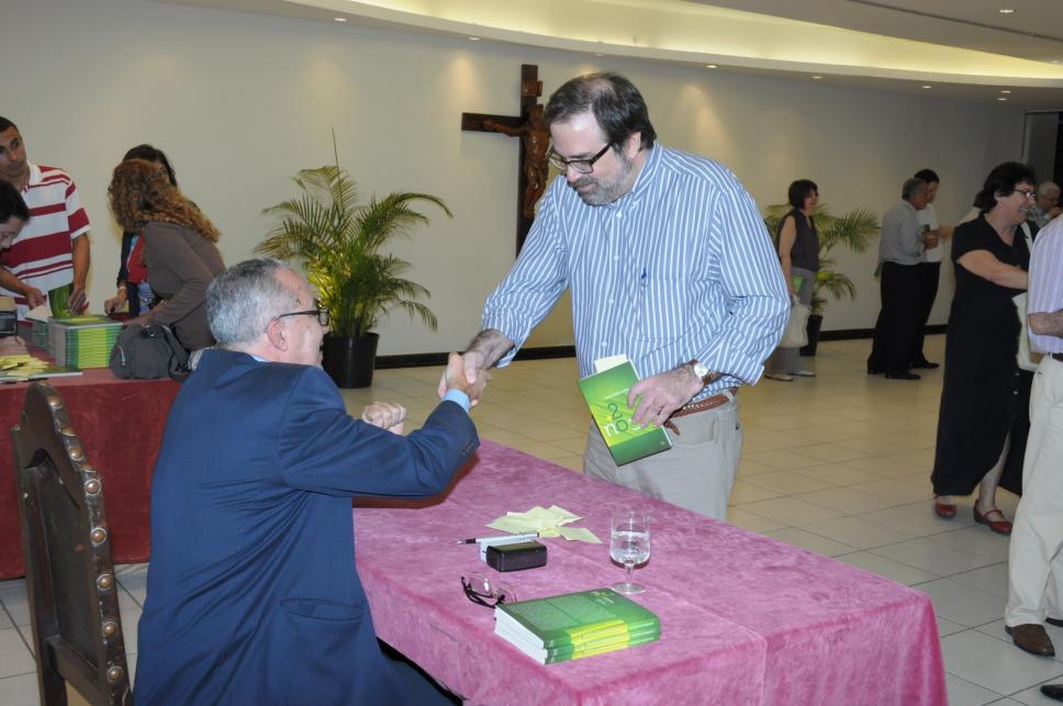 Convidado cumprimentando o Reitor Pe. Josafá S.J. na mesa de autógrafos.