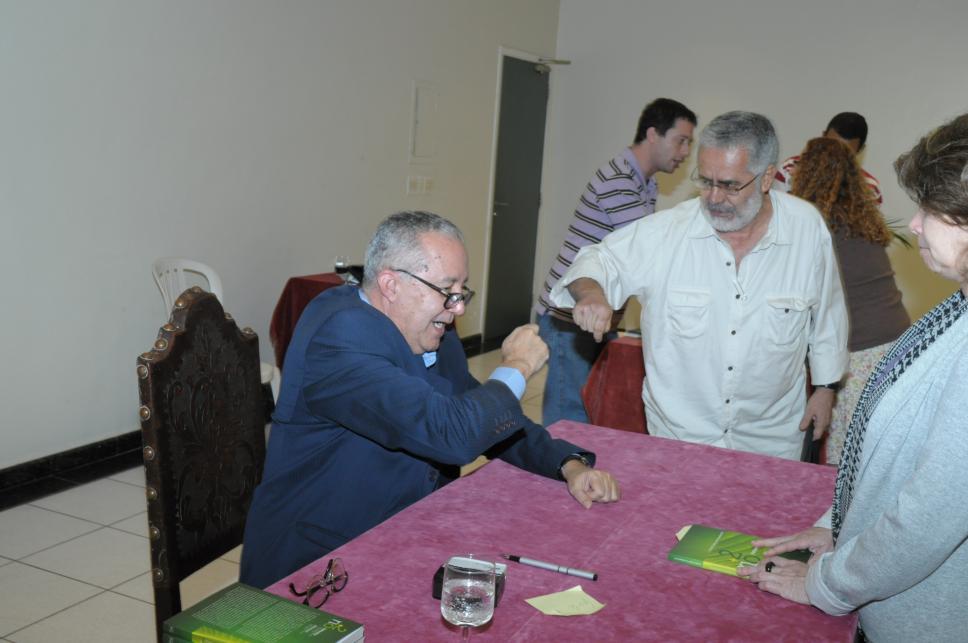 Convidado cumprimenta o Reitor Pe. Josafá S.J. na mesa de autógrafos.