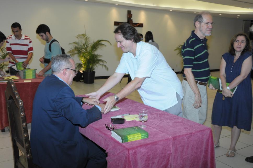 Convidado cumprimenta o Reitor Pe. Josafá S.J. na mesa de autógrafos.