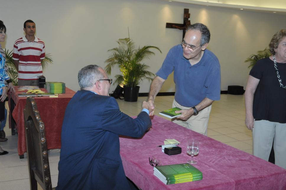 Convidado cumprimenta o Reitor Pe. Josafá S.J. na mesa de autógrafos.