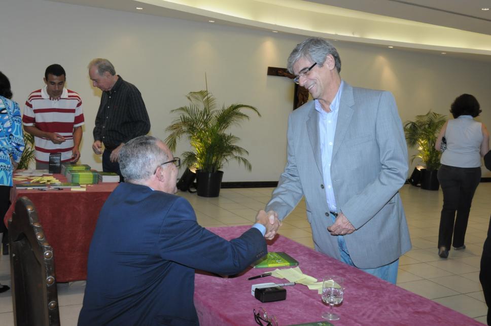 Convidado cumprimenta o Reitor Pe. Josafá S.J. na mesa de autógrafos.