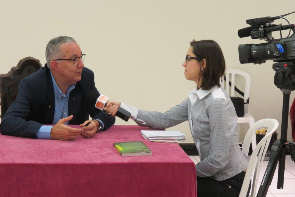 Reitor Pe. Josafá S.J. dá entrevista sobre seu livro em noite de autógrafos.
