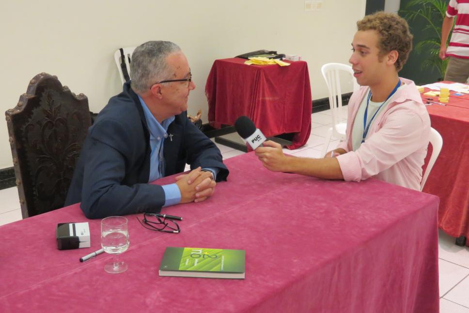 Reitor Pe. Josafá S.J. dá entrevista à TV PUC sobre seu livro na noite de autógrafos.