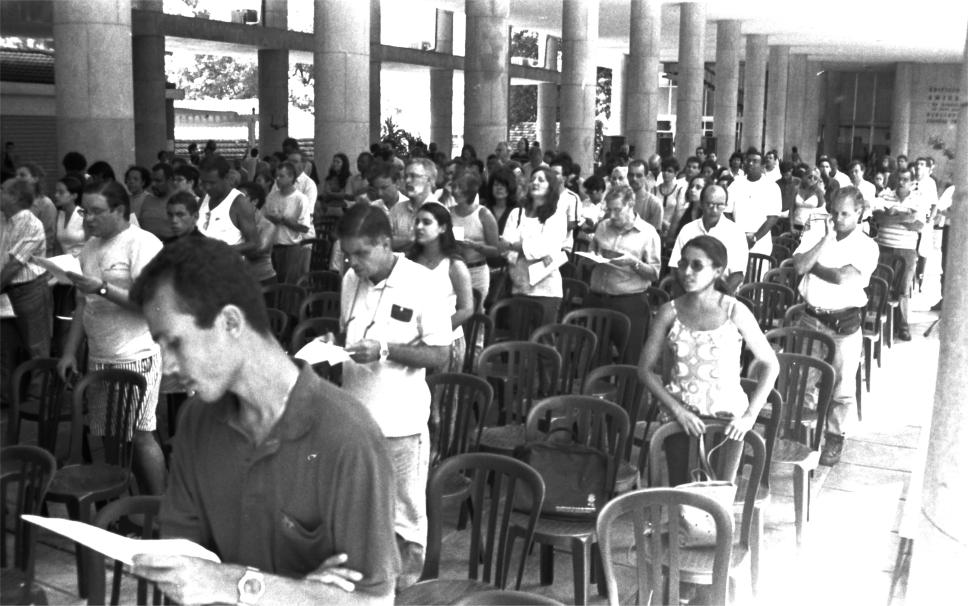 Funcionários e seus familiares em missa ocorrida no pilotis.
