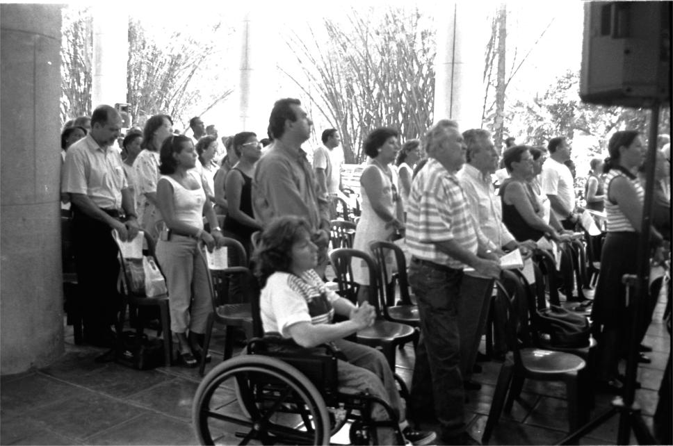 Funcionários e seus familiares em missa de Natal ocorrida nos pilotis.