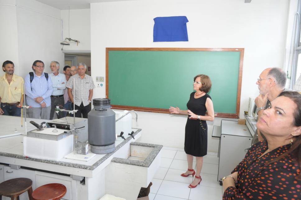 Professores, alunos e funcionários do departamento de química em laboratório durante homenagem ao prof. Miekeley.