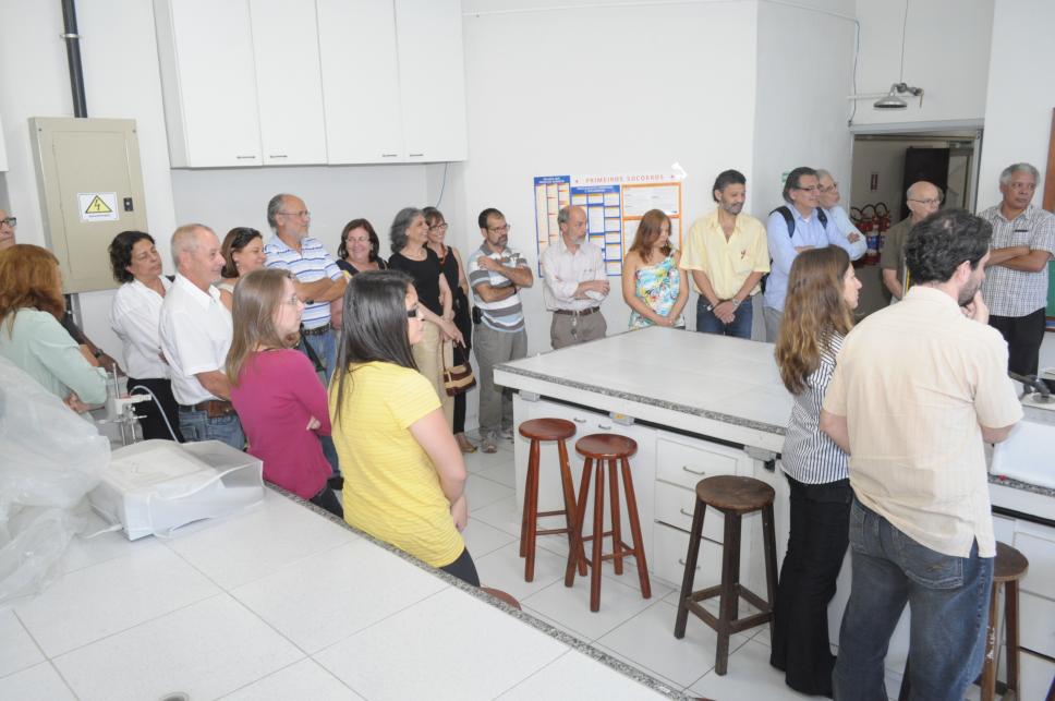 Professores, alunos e funcionários em laboratório durante homenagem ao prof. Miekeley.