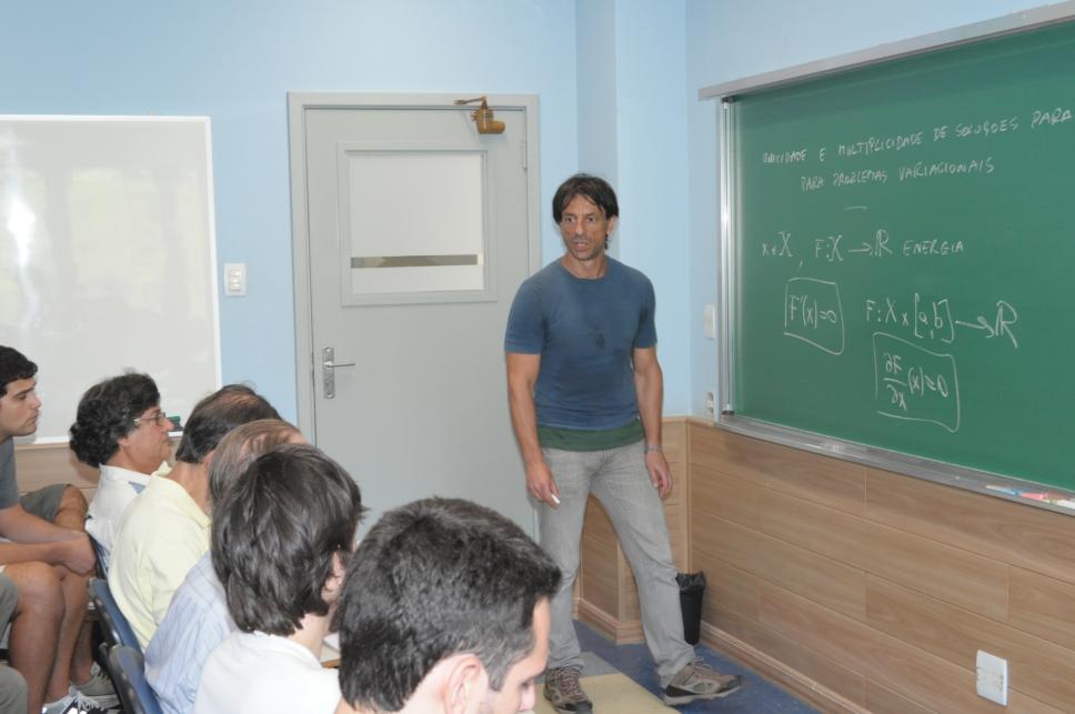 Prof. Paolo Piccione (IME/USP) apresentando aula em colóquio para alunos e professores do Departamento de Matemática.