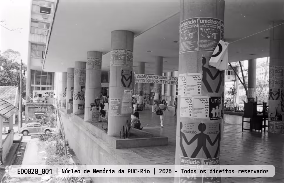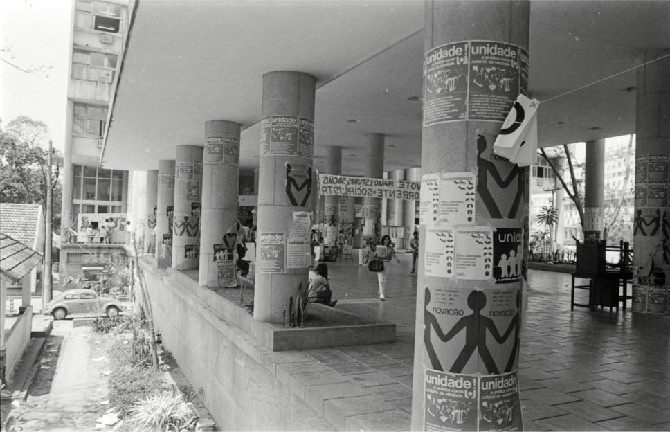 Pilotis com cartazes e faixas das chapas concorrentes ao DCE.