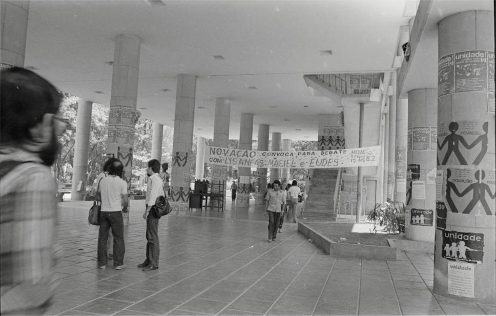Pilotis com propaganda das chapas concorrentes ao DCE. Destaque para os cartazes das chapas Unidade e Novação e a faixa "Novação convoca para debate com Lysâneas Maciel e Eudes".