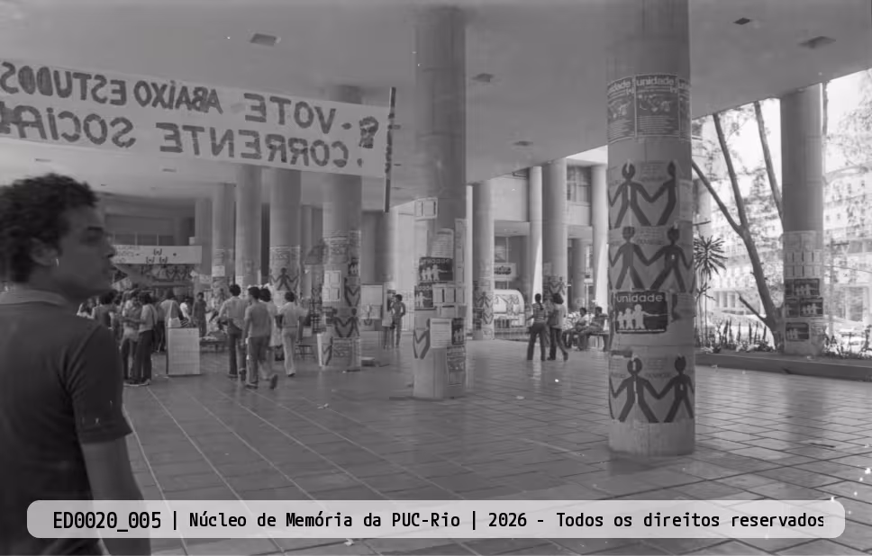 Pilotis com cartazes e faixas das chapas Unidade, Novação, Transformando e Corrente Socialista.